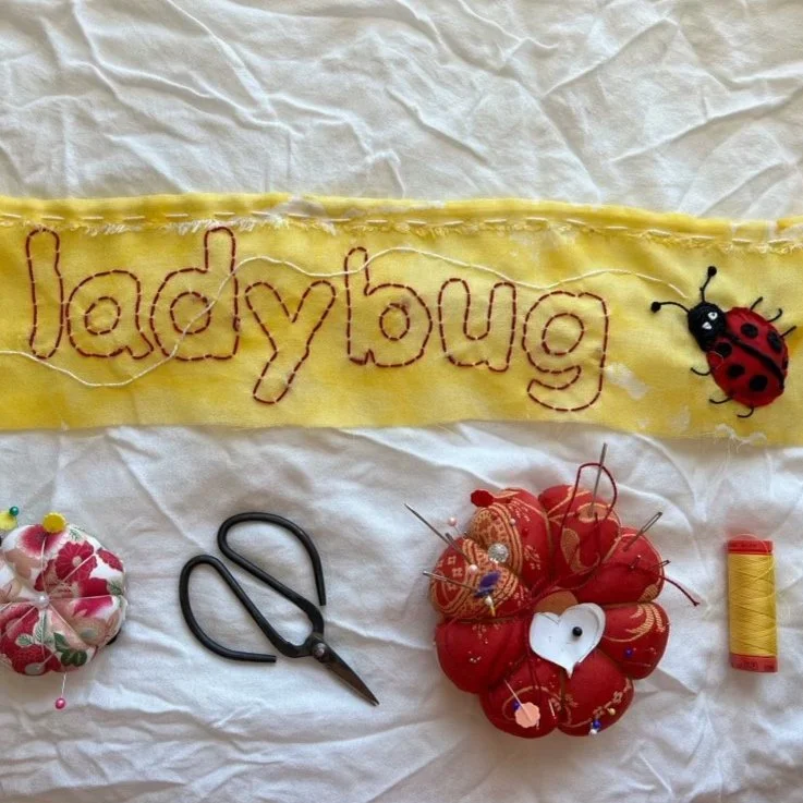 Tucked inside her carry-on are fragments of perfect fabrics, #8 straw needles, cotton thread, a thimble and thread cutter. And tucked inside her, a never ending imagination, pure delight in designing and creating perfectly imperfect charming pieces, and a whimsical and empathetic world view.